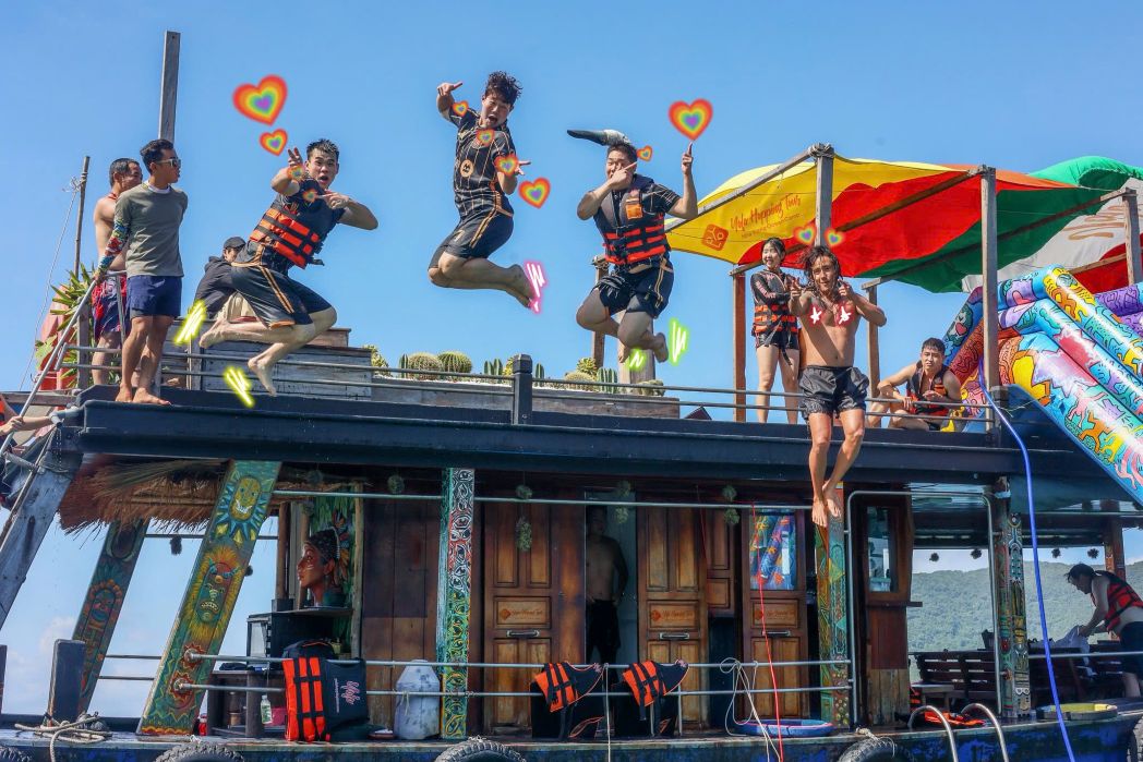 - Bar nổi & phao trượt khổng lồ: Quý du khách được trải nghiệm phong cách “quẫy” trên biển hoàn toàn khác biệt cùng bar nổi cực chất & phao trượt khổng lồ từ tầng hai của tàu thẳng xuống biển, đoàn dùng trái cây – bánh