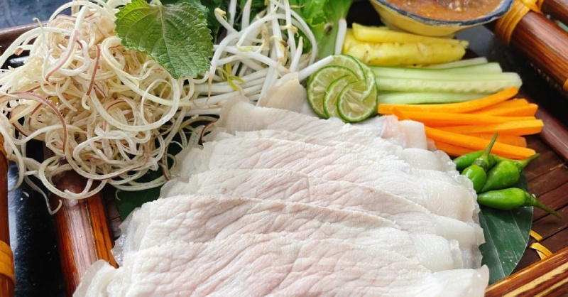 Quý khách dùng bữa trưa nhà hàng với đặc sản nổi tiếng Đà Nẵng “Bánh tráng thịt heo 2 đầu da”.